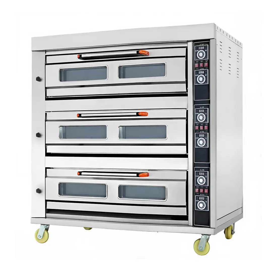 A high-capacity, industrial-grade 3-deck gas oven featuring 9-tray production, designed for precise high-temperature baking and roasting in high-volume commercial bakeries and kitchens.
