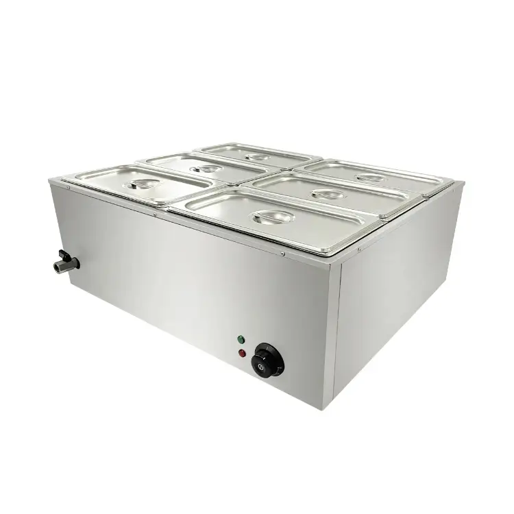 The Albasha Bain Marie 6 GN Container is a high-efficiency tabletop warming solution designed for the rigorous demands of professional catering and buffet service. Engineered for maximum reliability, this unit utilizes a heavy-duty heating element system to maintain consistent serving temperatures across six individual compartments. Its compact, low-profile design allows it to fit seamlessly onto any countertop while providing the high-volume capacity needed for busy deli or restaurant environments.